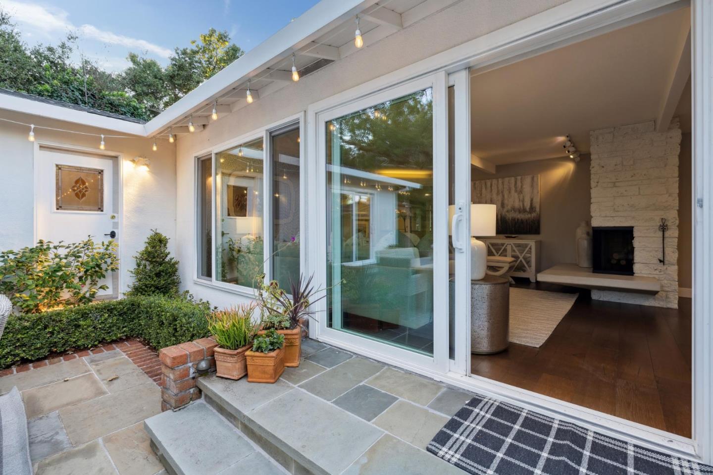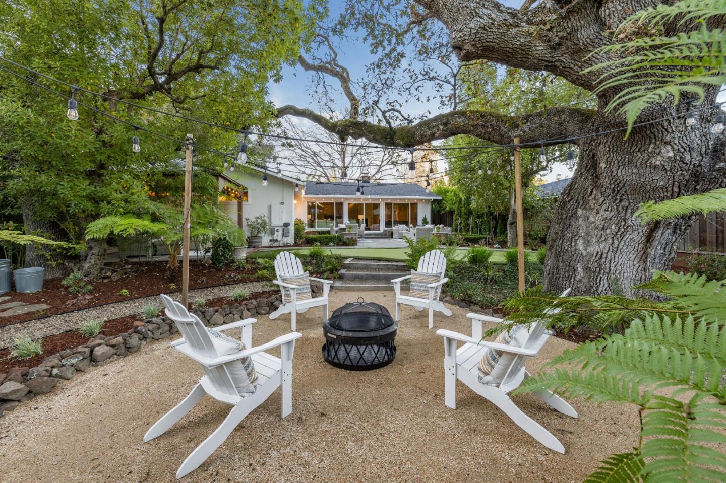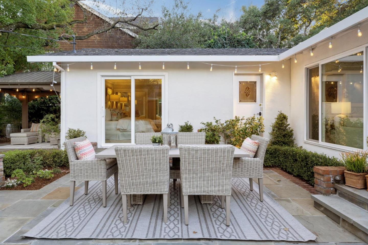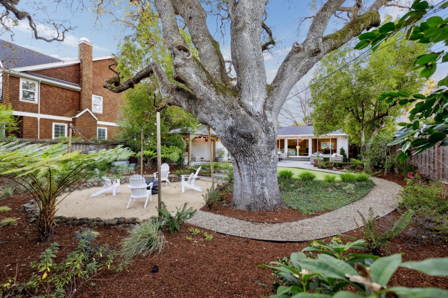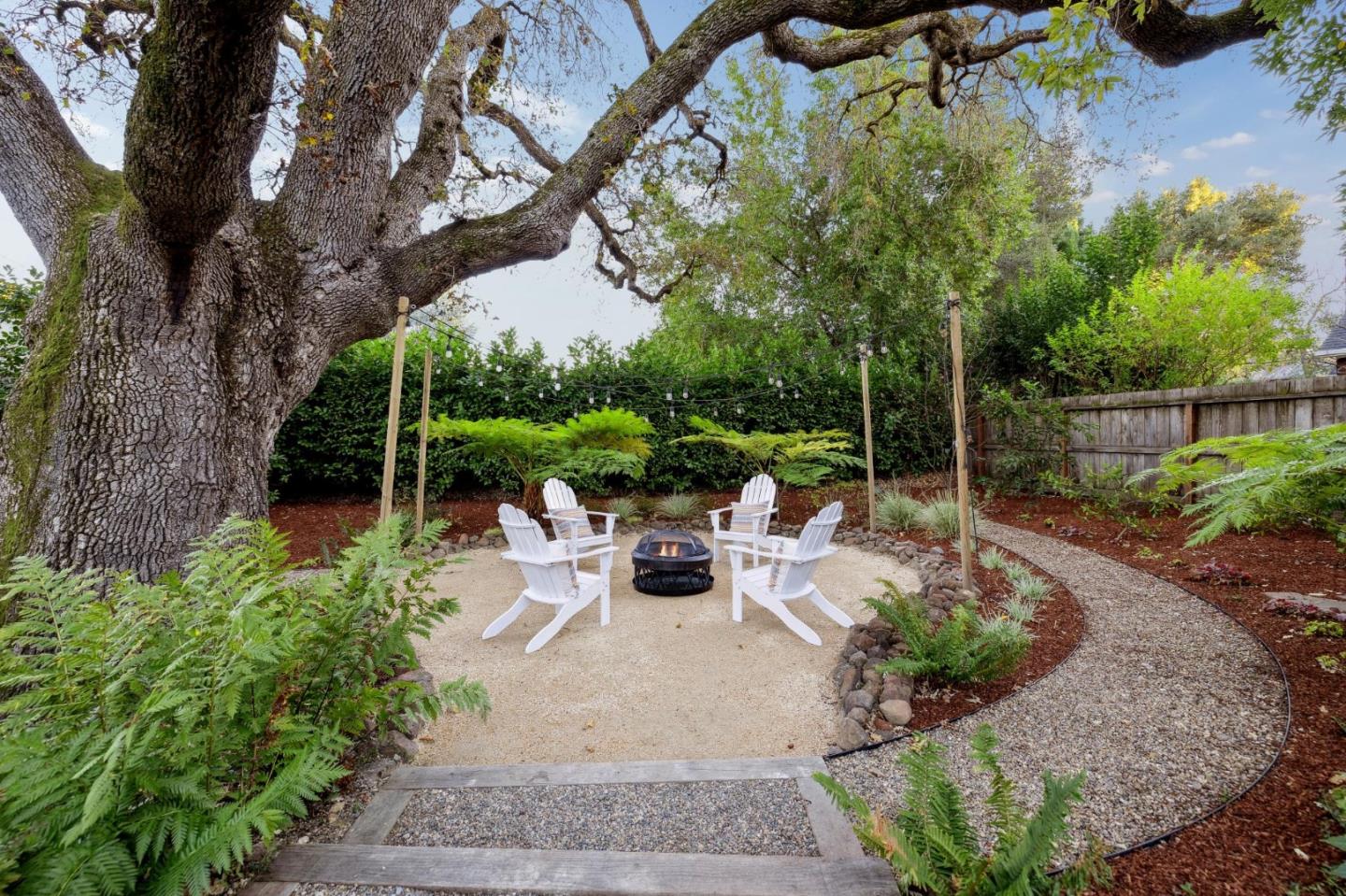 On a small cul-de-sac lined with majestic trees, a storybook setting was created on a 9300+/- sq. ft. lot for this charming, updated, 2-bedroom, 2-bathroom home with farmhouse-style appeal. A lush lawn and pleasant garden precede the porch entrance where inside you will find golden hardwood floors, freshly painted walls and trim, sparkling windows and glass doors, lovely lighting and a magical atmosphere. Enjoy culinary arts in the kitchen with marble counters, shaker cabinets, stainless steel appliances and casual dining area. The living and dining rooms share a beamed ceiling, stone fireplace and wall of windows that showcases the enchanting back yard with a slate patio designed for entertaining and dancing under the stars, and a magnificent Heritage oak tree that will take your breath away. After a long day, retreat to your primary bedroom suite with views and access to the back yard, or enjoy quiet mornings in the gazebo while admiring your secret gardens.