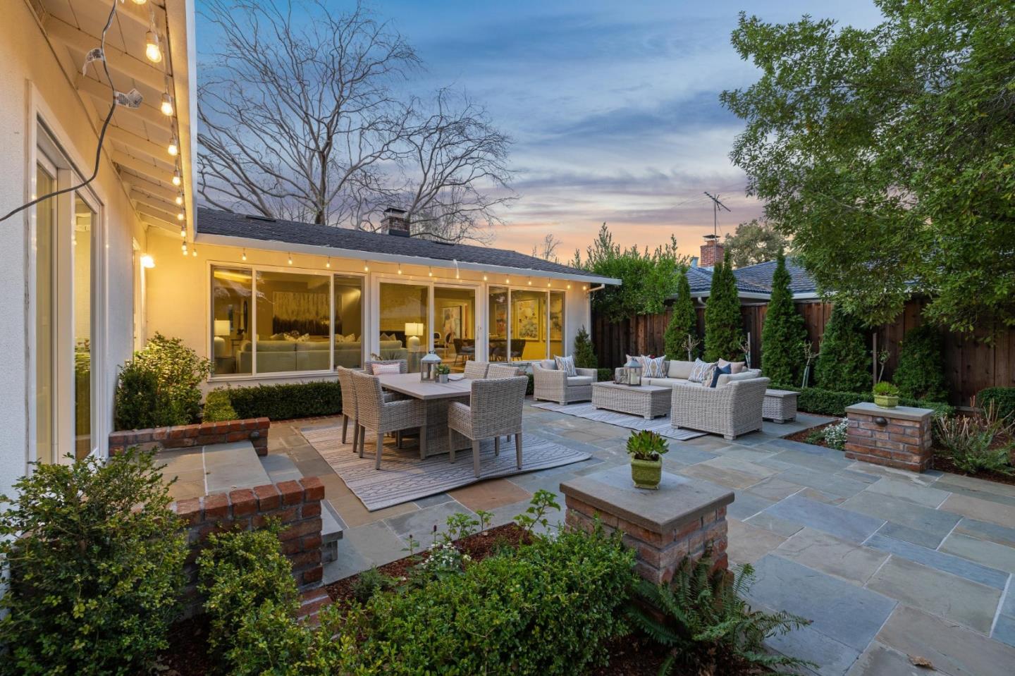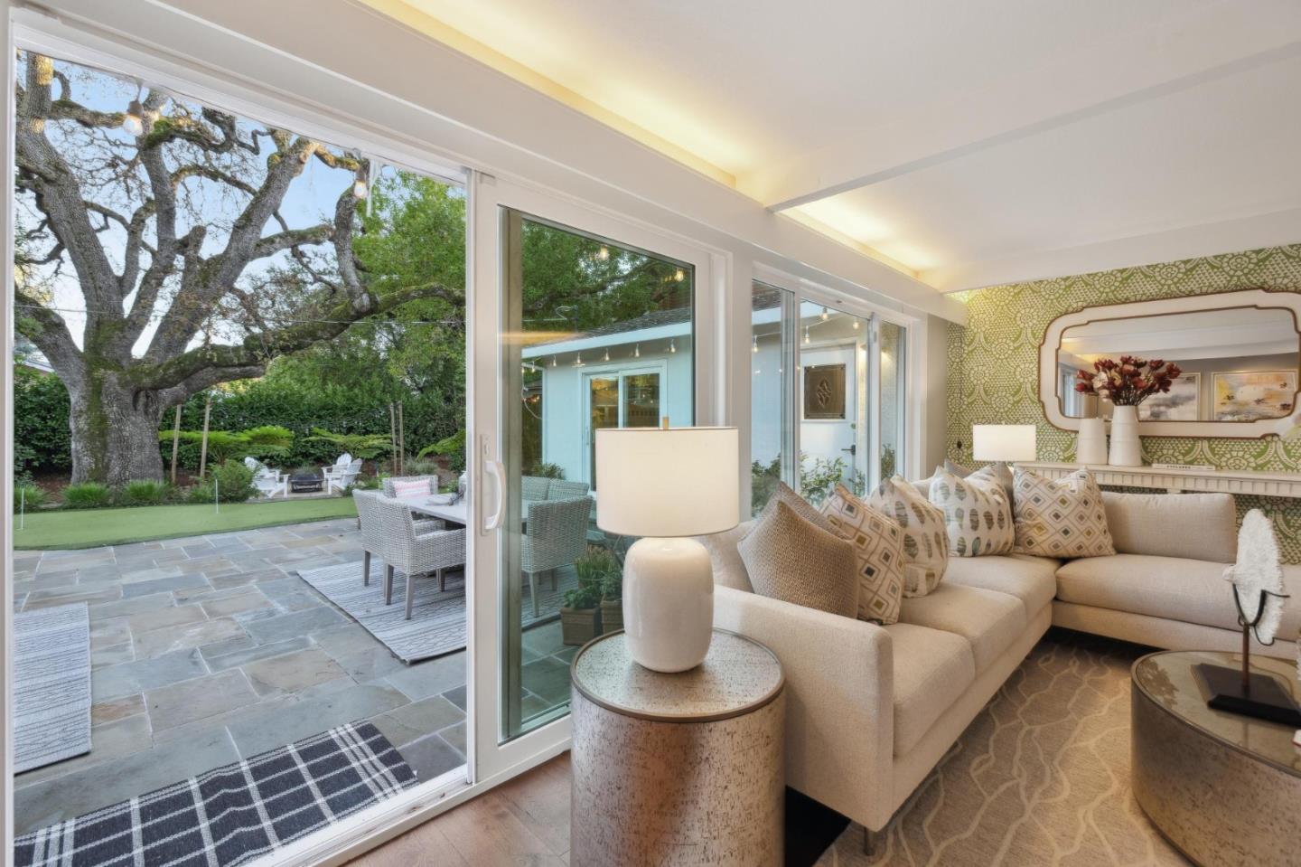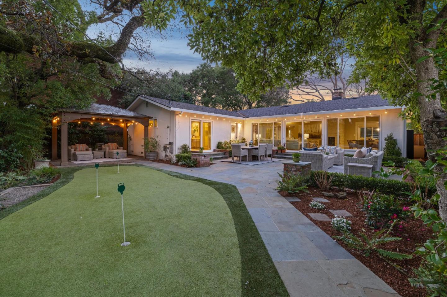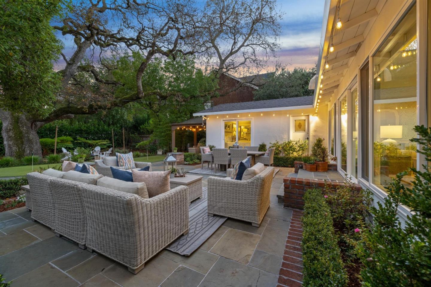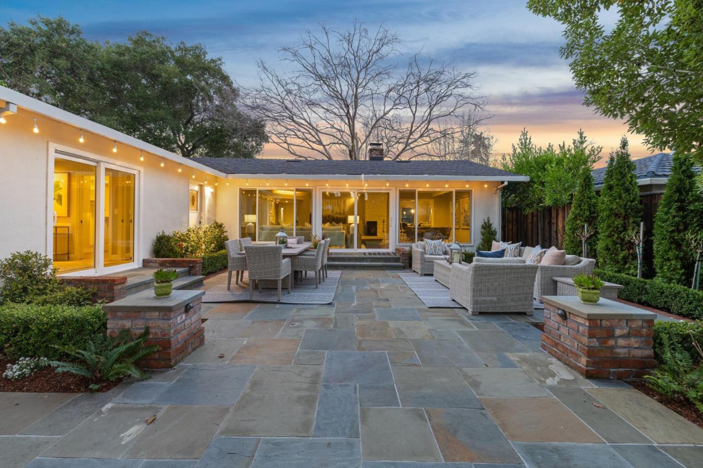 On a small cul-de-sac lined with majestic trees, a storybook setting was created on a 9300+/- sq. ft. lot for this charming, updated, 2-bedroom, 2-bathroom home with farmhouse-style appeal. A lush lawn and pleasant garden precede the porch entrance where inside you will find golden hardwood floors, freshly painted walls and trim, sparkling windows and glass doors, lovely lighting and a magical atmosphere. Enjoy culinary arts in the kitchen with marble counters, shaker cabinets, stainless steel appliances and casual dining area. The living and dining rooms share a beamed ceiling, stone fireplace and wall of windows that showcases the enchanting back yard with a slate patio designed for entertaining and dancing under the stars, and a magnificent Heritage oak tree that will take your breath away. After a long day, retreat to your primary bedroom suite with views and access to the back yard, or enjoy quiet mornings in the gazebo while admiring your secret gardens.