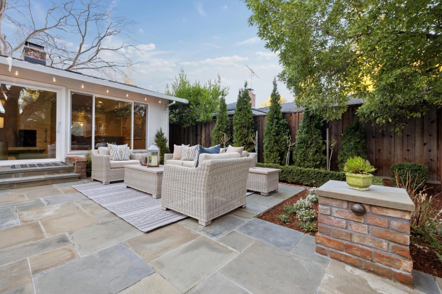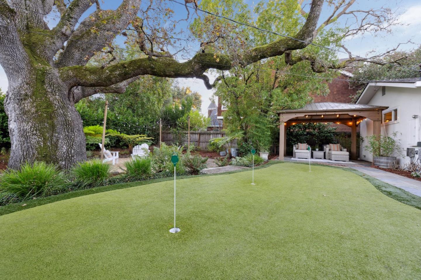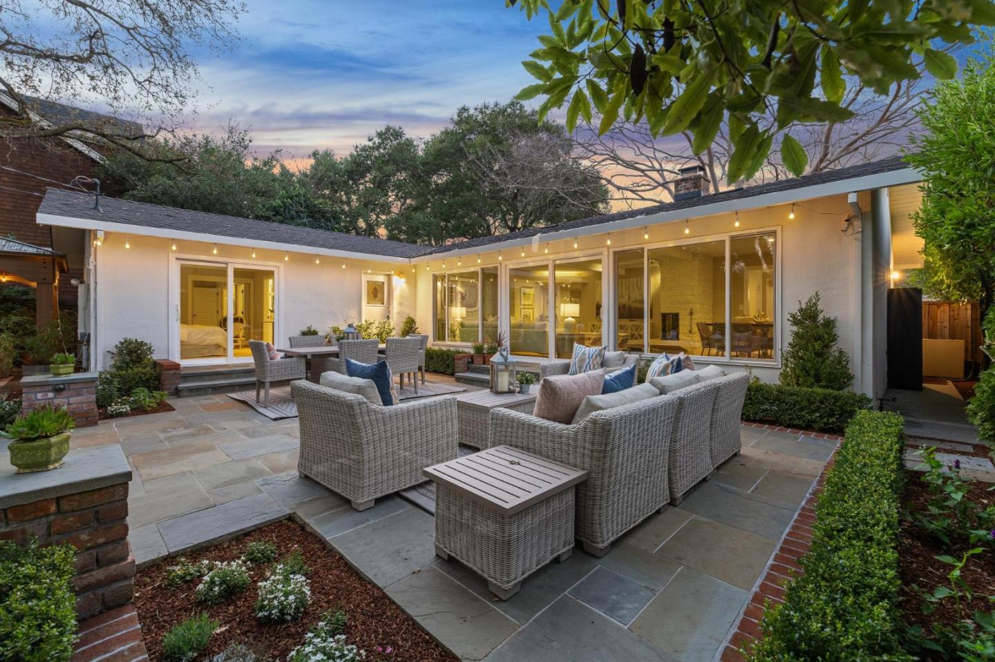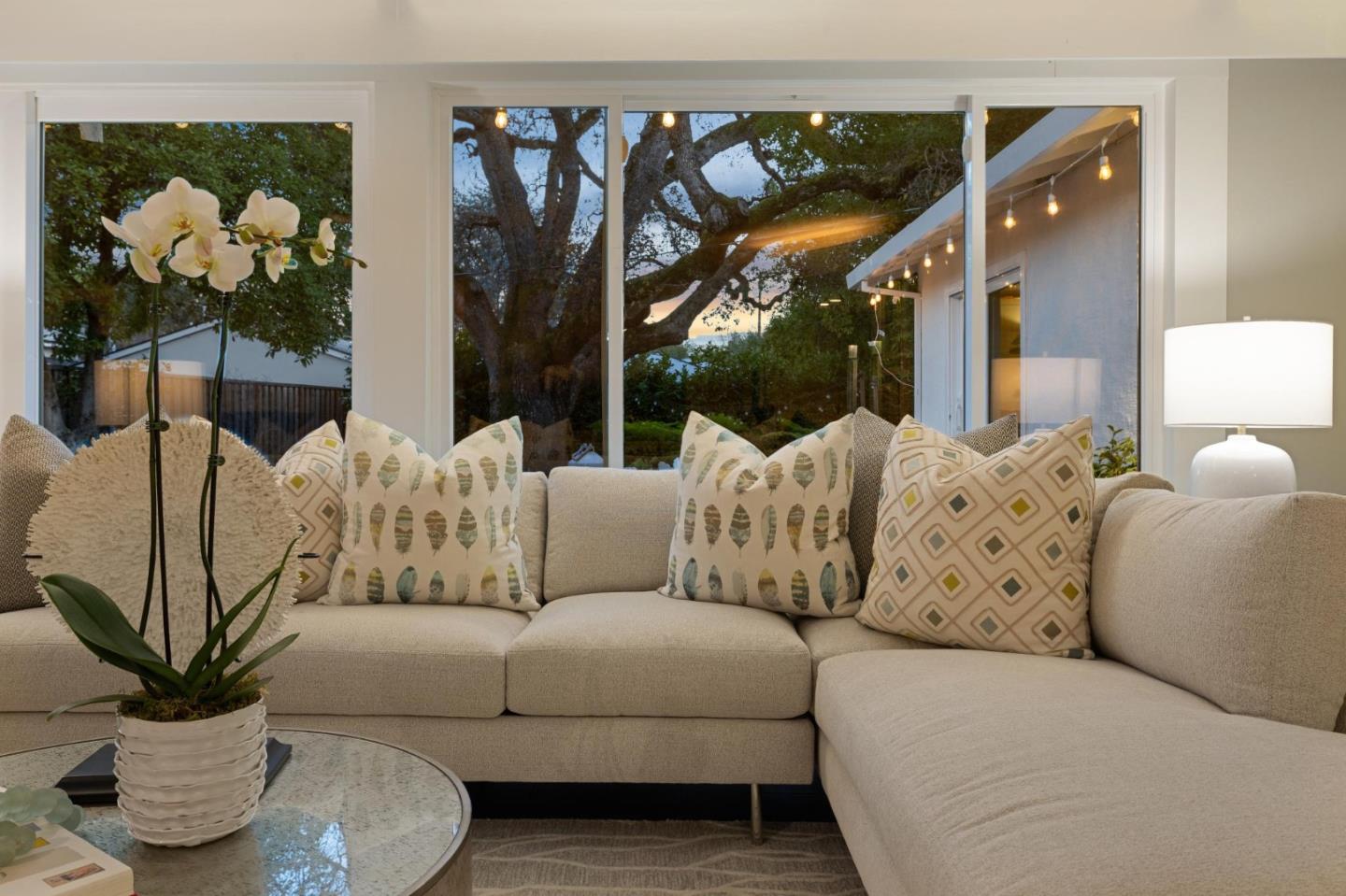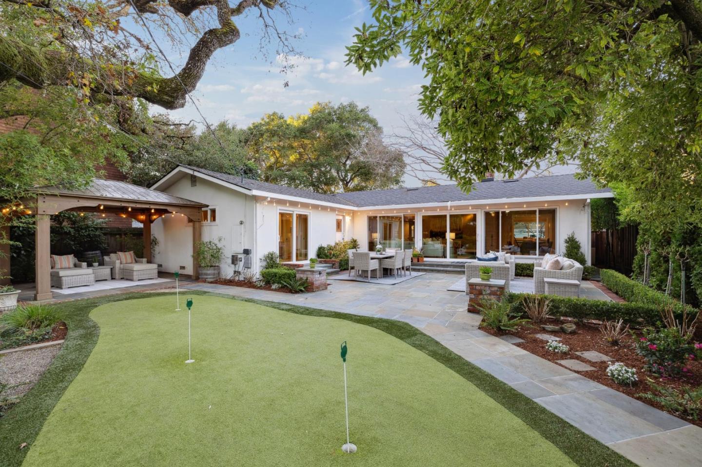 On a small cul-de-sac lined with majestic trees, a storybook setting was created on a 9300+/- sq. ft. lot for this charming, updated, 2-bedroom, 2-bathroom home with farmhouse-style appeal. A lush lawn and pleasant garden precede the porch entrance where inside you will find golden hardwood floors, freshly painted walls and trim, sparkling windows and glass doors, lovely lighting and a magical atmosphere. Enjoy culinary arts in the kitchen with marble counters, shaker cabinets, stainless steel appliances and casual dining area. The living and dining rooms share a beamed ceiling, stone fireplace and wall of windows that showcases the enchanting back yard with a slate patio designed for entertaining and dancing under the stars, and a magnificent Heritage oak tree that will take your breath away. After a long day, retreat to your primary bedroom suite with views and access to the back yard, or enjoy quiet mornings in the gazebo while admiring your secret gardens.