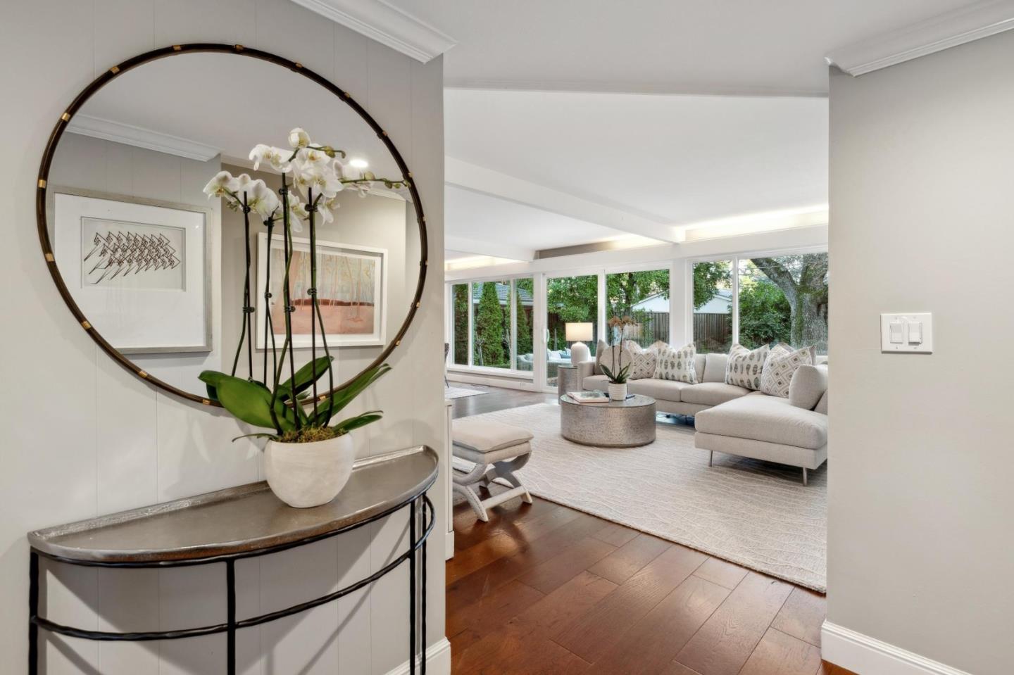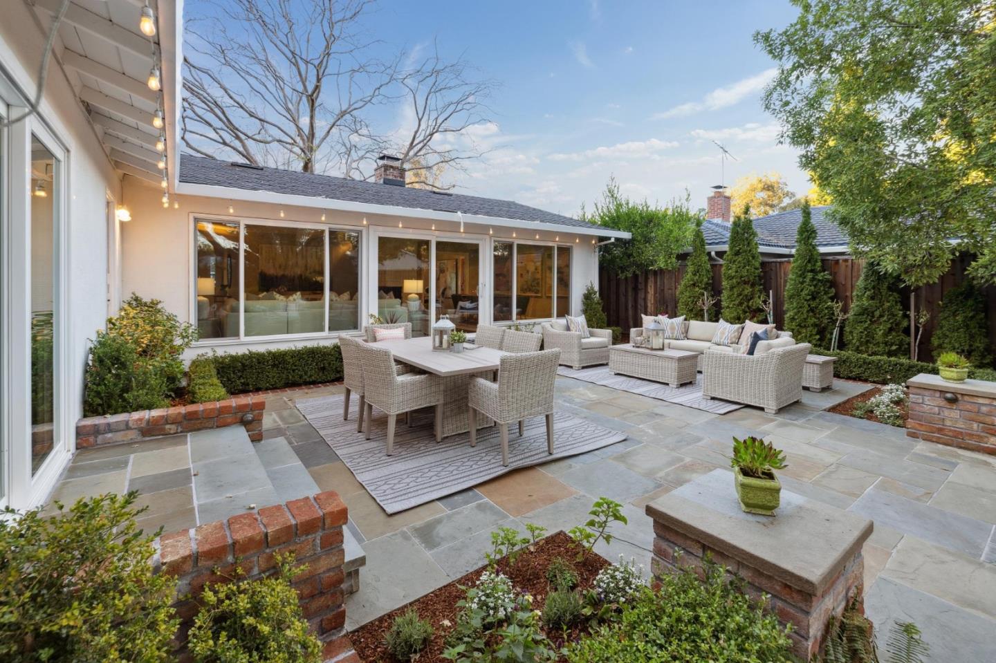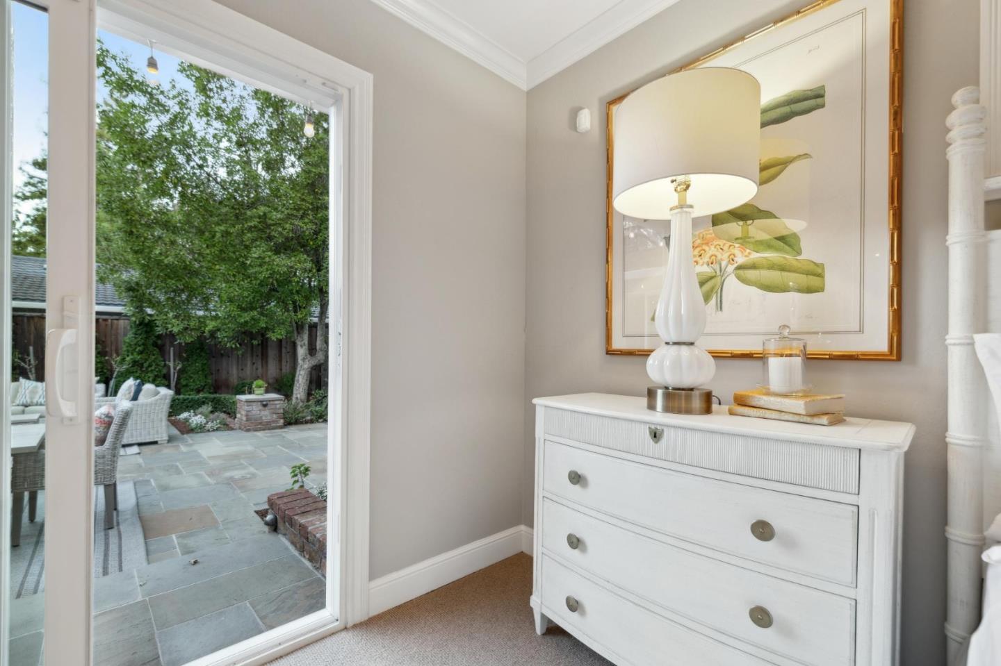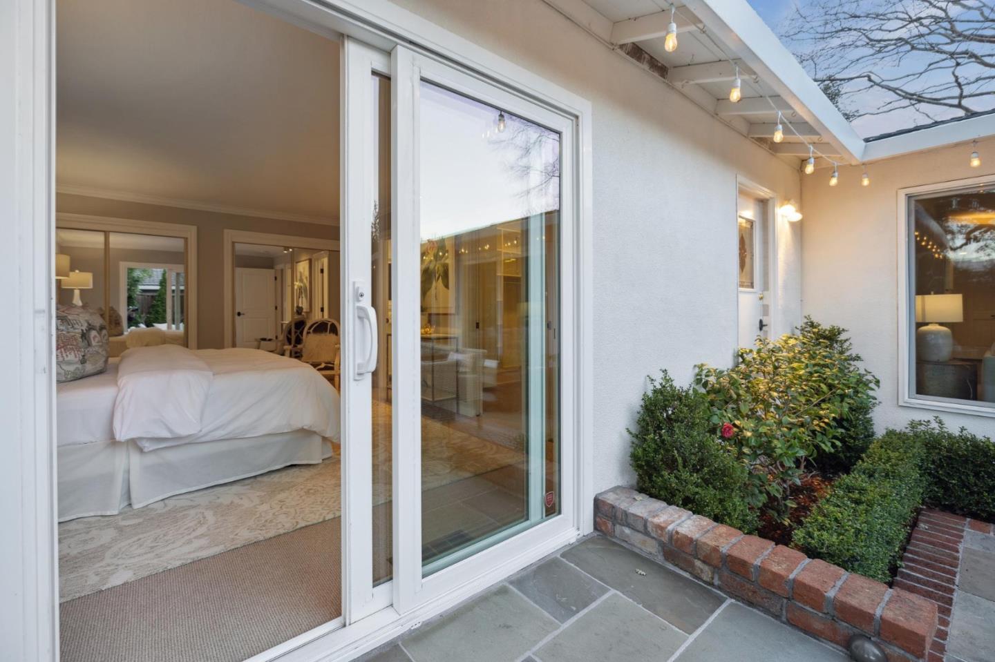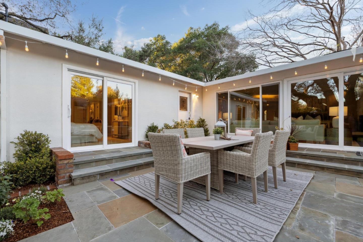 On a small cul-de-sac lined with majestic trees, a storybook setting was created on a 9300+/- sq. ft. lot for this charming, updated, 2-bedroom, 2-bathroom home with farmhouse-style appeal. A lush lawn and pleasant garden precede the porch entrance where inside you will find golden hardwood floors, freshly painted walls and trim, sparkling windows and glass doors, lovely lighting and a magical atmosphere. Enjoy culinary arts in the kitchen with marble counters, shaker cabinets, stainless steel appliances and casual dining area. The living and dining rooms share a beamed ceiling, stone fireplace and wall of windows that showcases the enchanting back yard with a slate patio designed for entertaining and dancing under the stars, and a magnificent Heritage oak tree that will take your breath away. After a long day, retreat to your primary bedroom suite with views and access to the back yard, or enjoy quiet mornings in the gazebo while admiring your secret gardens.