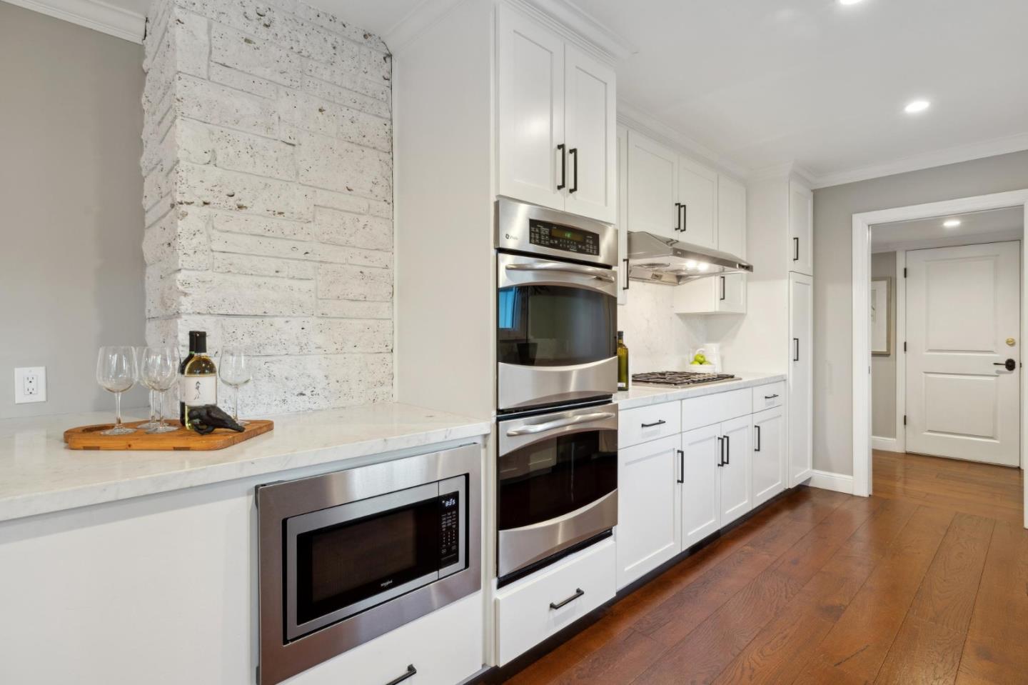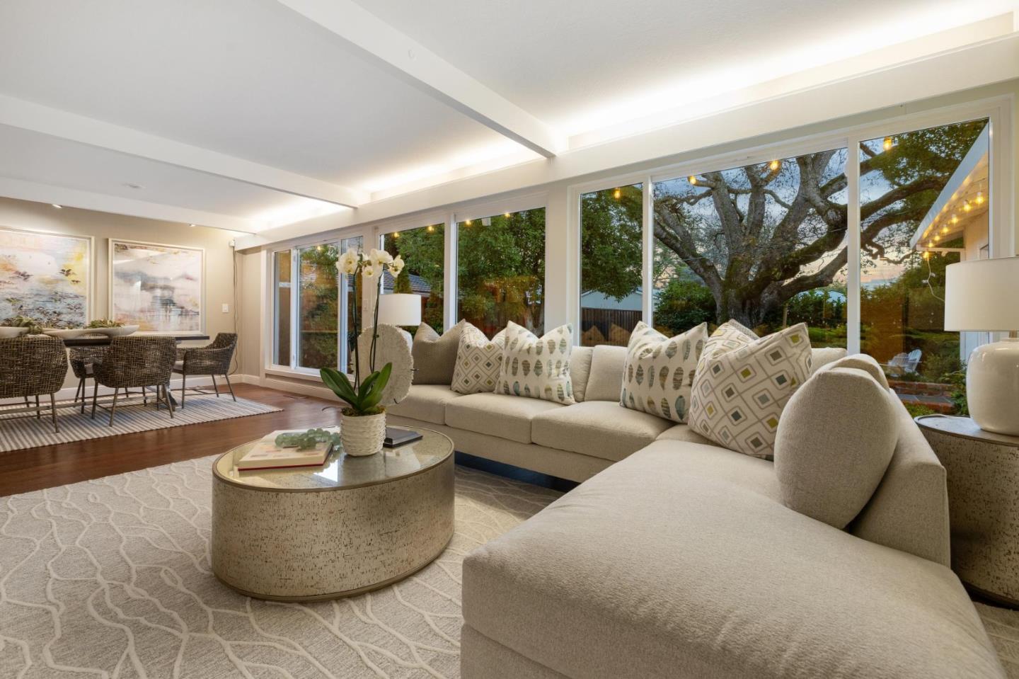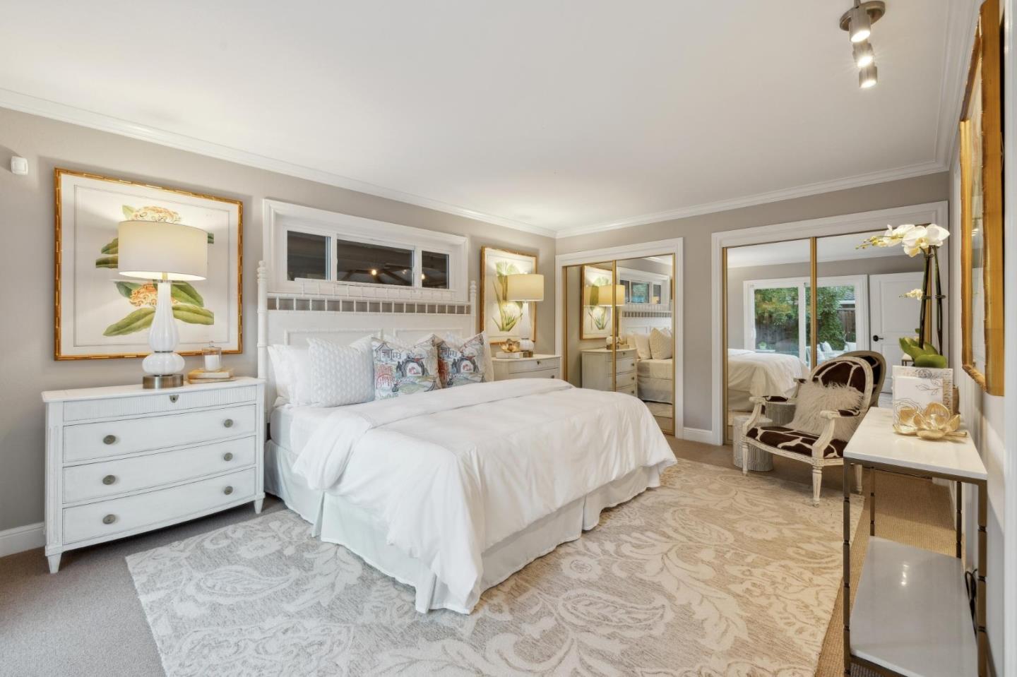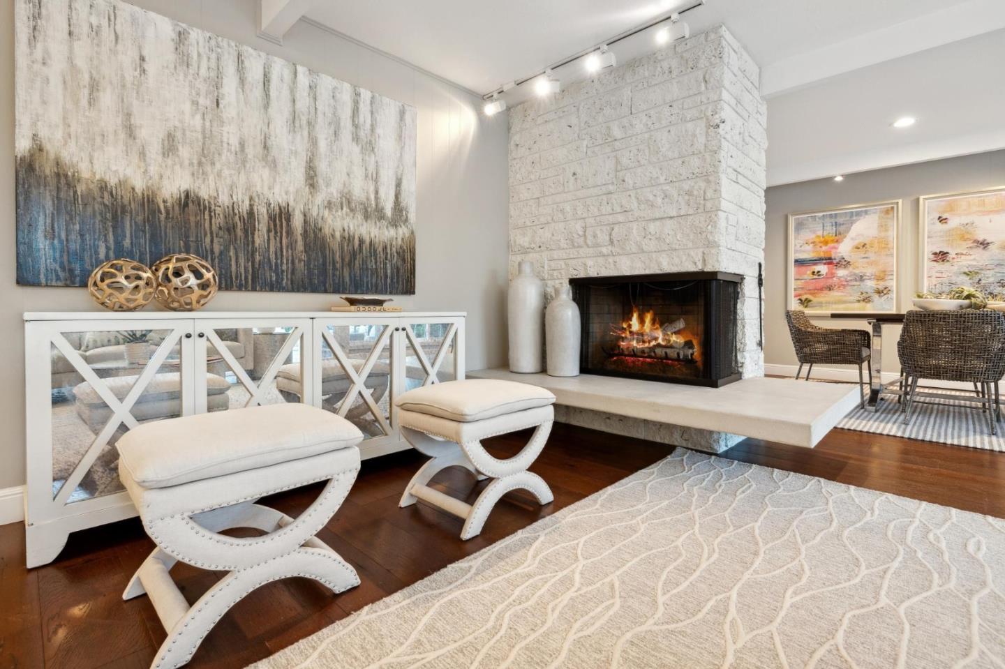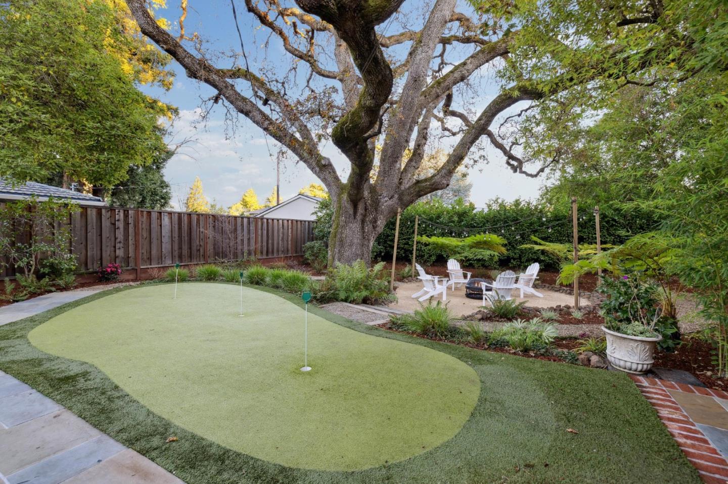 On a small cul-de-sac lined with majestic trees, a storybook setting was created on a 9300+/- sq. ft. lot for this charming, updated, 2-bedroom, 2-bathroom home with farmhouse-style appeal. A lush lawn and pleasant garden precede the porch entrance where inside you will find golden hardwood floors, freshly painted walls and trim, sparkling windows and glass doors, lovely lighting and a magical atmosphere. Enjoy culinary arts in the kitchen with marble counters, shaker cabinets, stainless steel appliances and casual dining area. The living and dining rooms share a beamed ceiling, stone fireplace and wall of windows that showcases the enchanting back yard with a slate patio designed for entertaining and dancing under the stars, and a magnificent Heritage oak tree that will take your breath away. After a long day, retreat to your primary bedroom suite with views and access to the back yard, or enjoy quiet mornings in the gazebo while admiring your secret gardens.