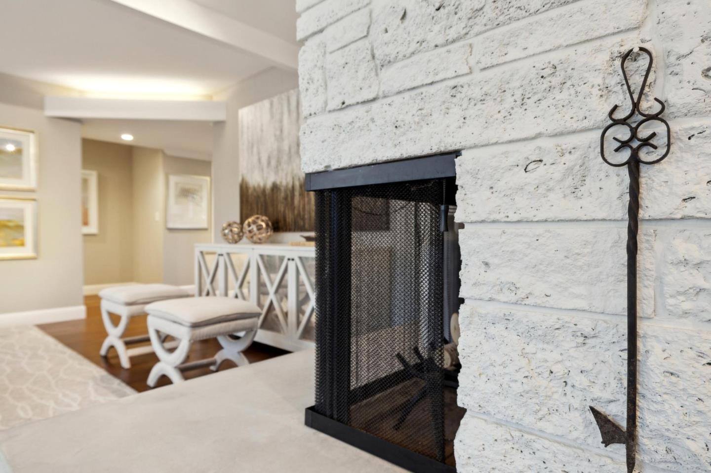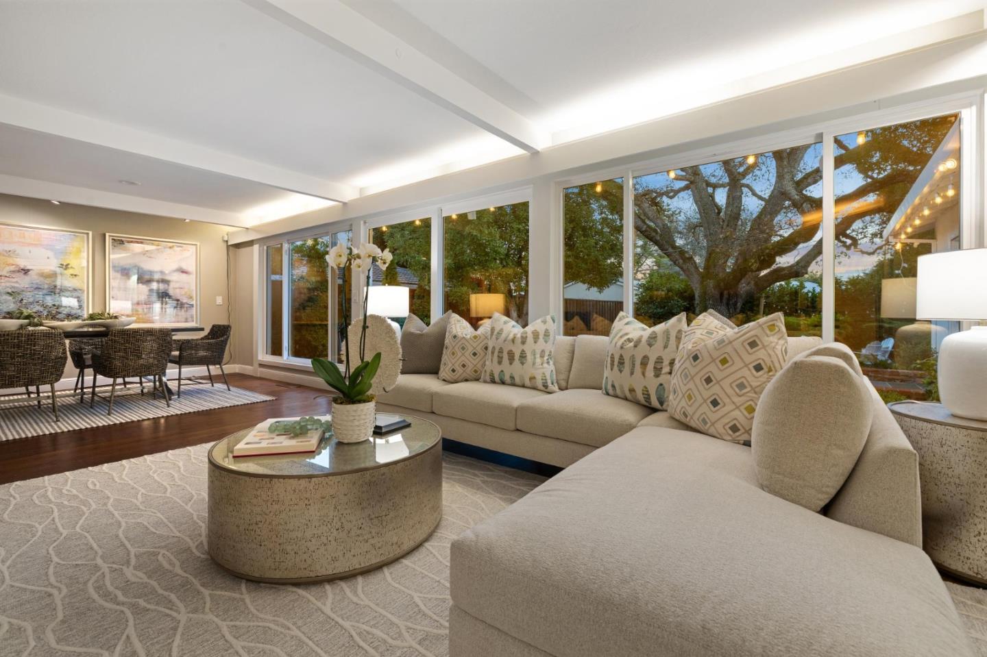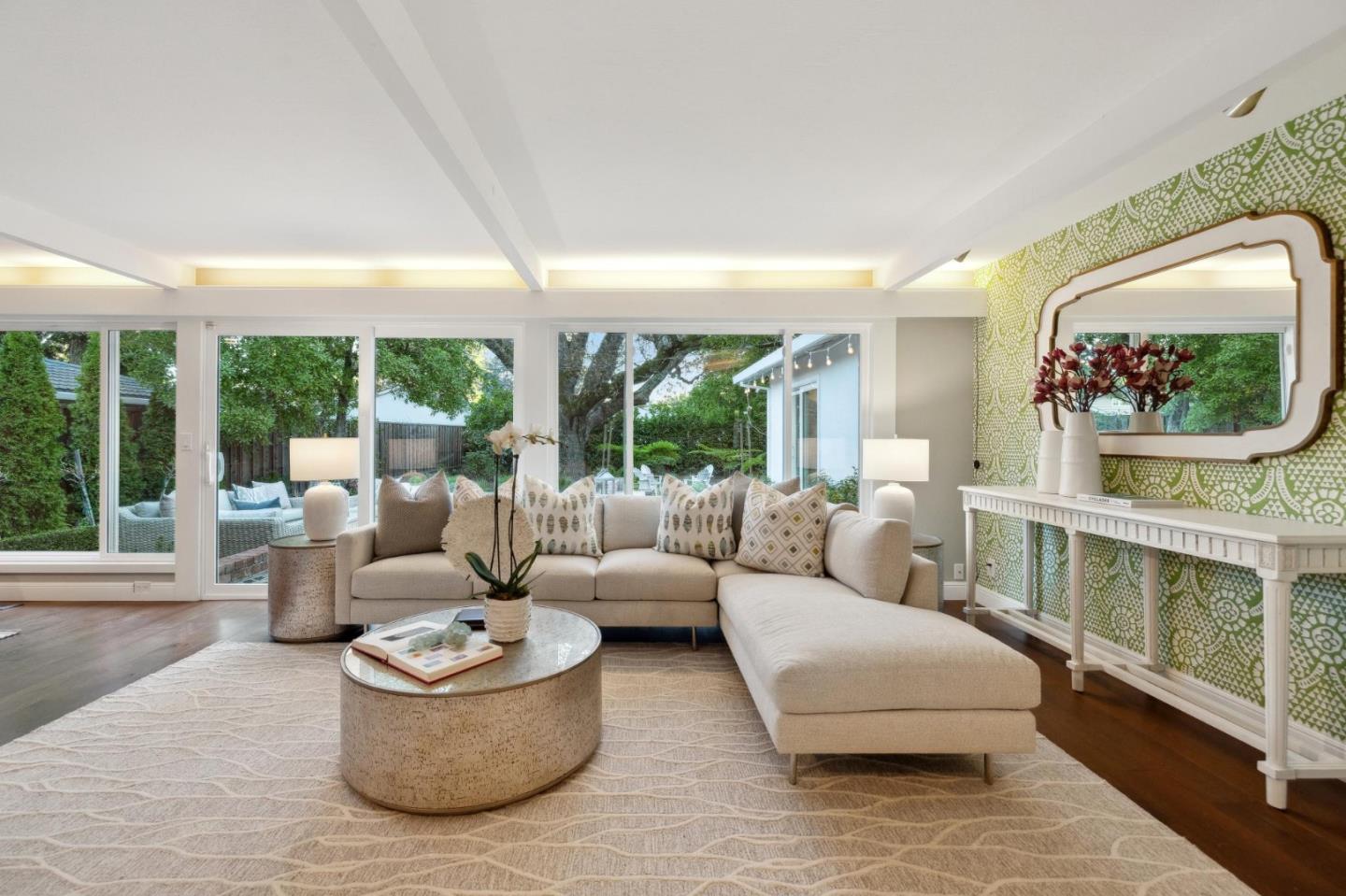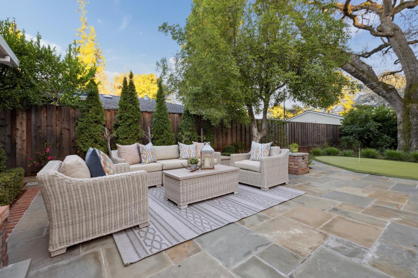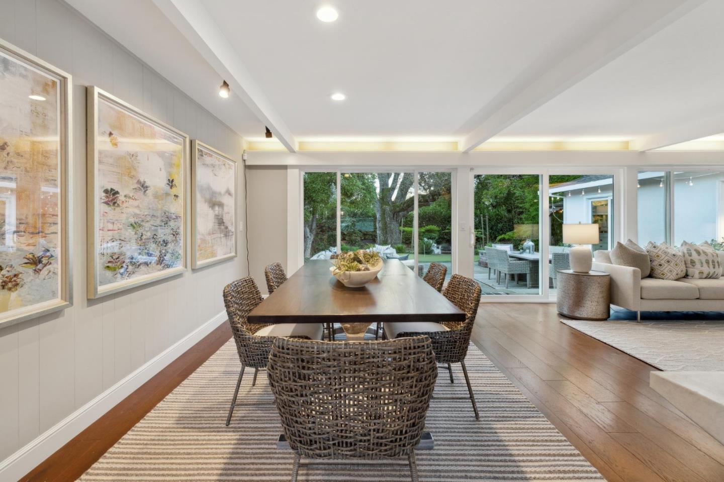 On a small cul-de-sac lined with majestic trees, a storybook setting was created on a 9300+/- sq. ft. lot for this charming, updated, 2-bedroom, 2-bathroom home with farmhouse-style appeal. A lush lawn and pleasant garden precede the porch entrance where inside you will find golden hardwood floors, freshly painted walls and trim, sparkling windows and glass doors, lovely lighting and a magical atmosphere. Enjoy culinary arts in the kitchen with marble counters, shaker cabinets, stainless steel appliances and casual dining area. The living and dining rooms share a beamed ceiling, stone fireplace and wall of windows that showcases the enchanting back yard with a slate patio designed for entertaining and dancing under the stars, and a magnificent Heritage oak tree that will take your breath away. After a long day, retreat to your primary bedroom suite with views and access to the back yard, or enjoy quiet mornings in the gazebo while admiring your secret gardens.