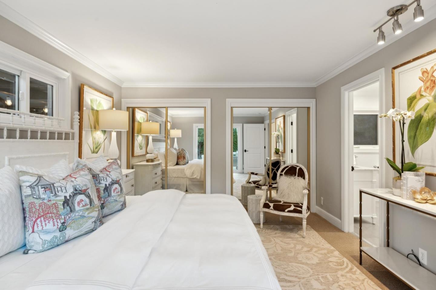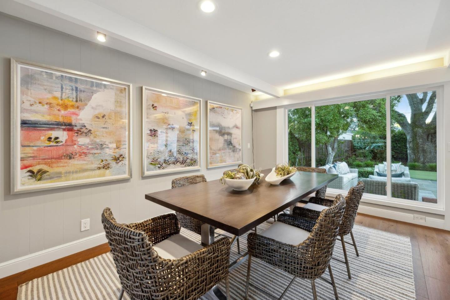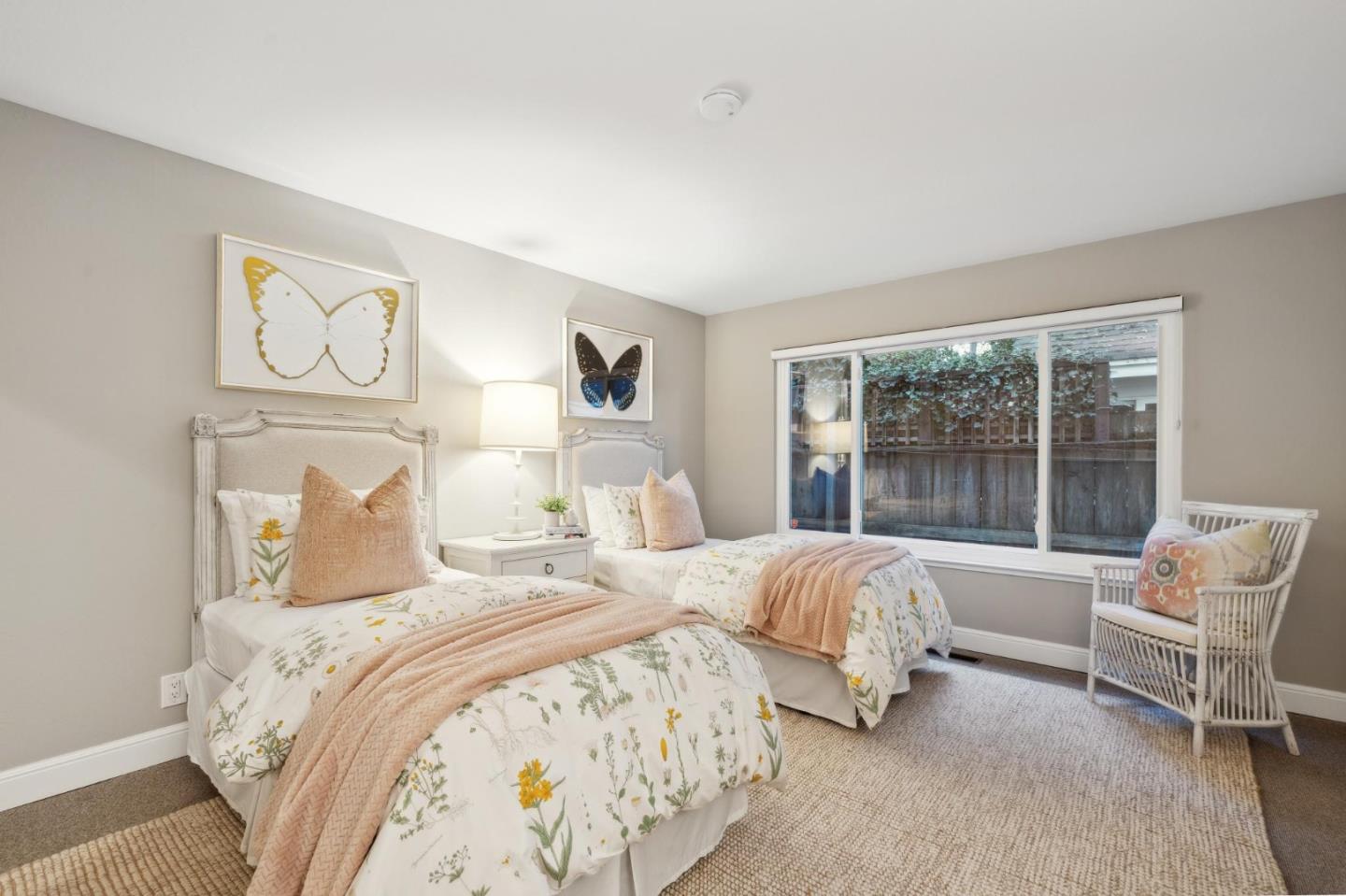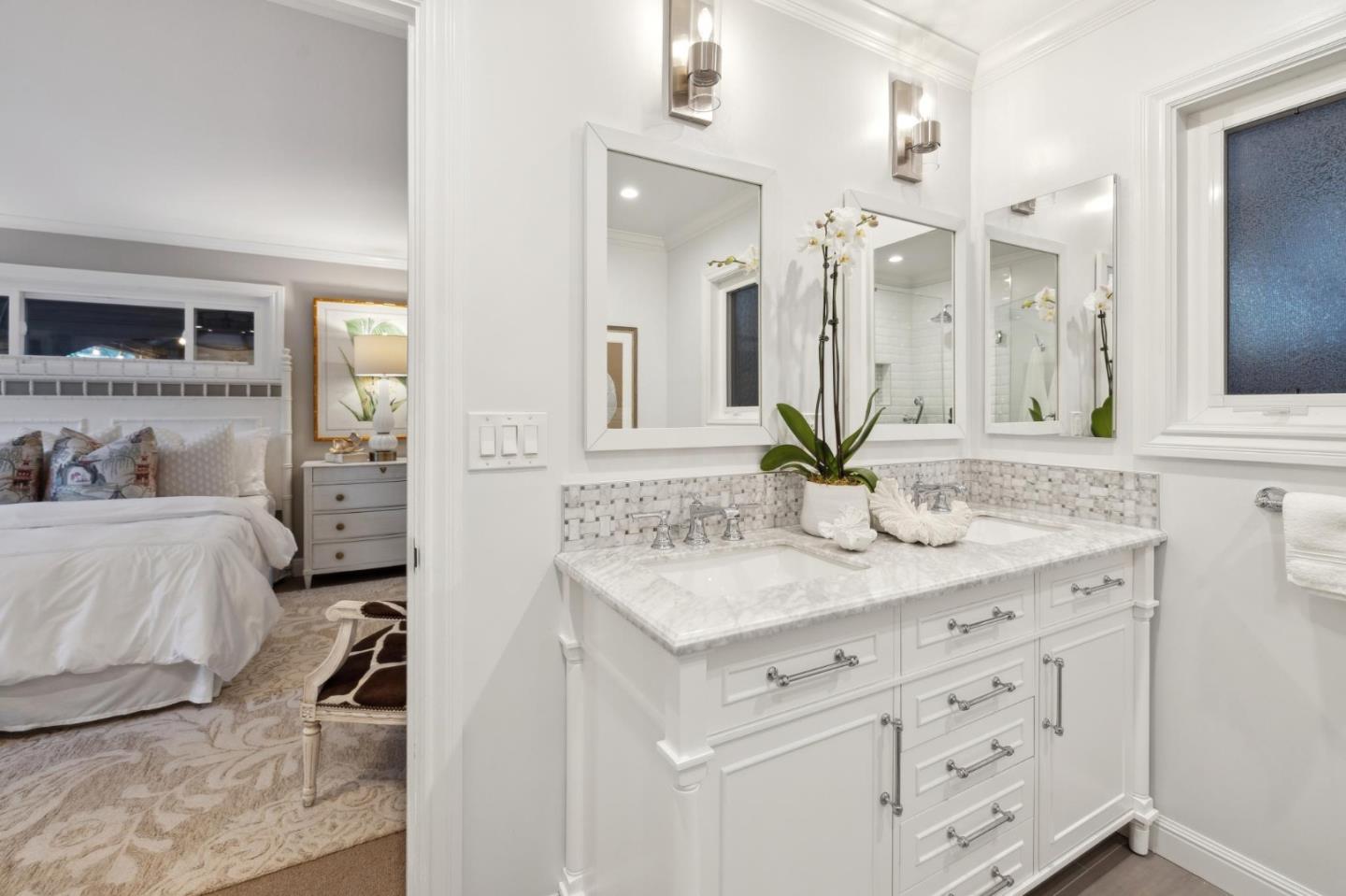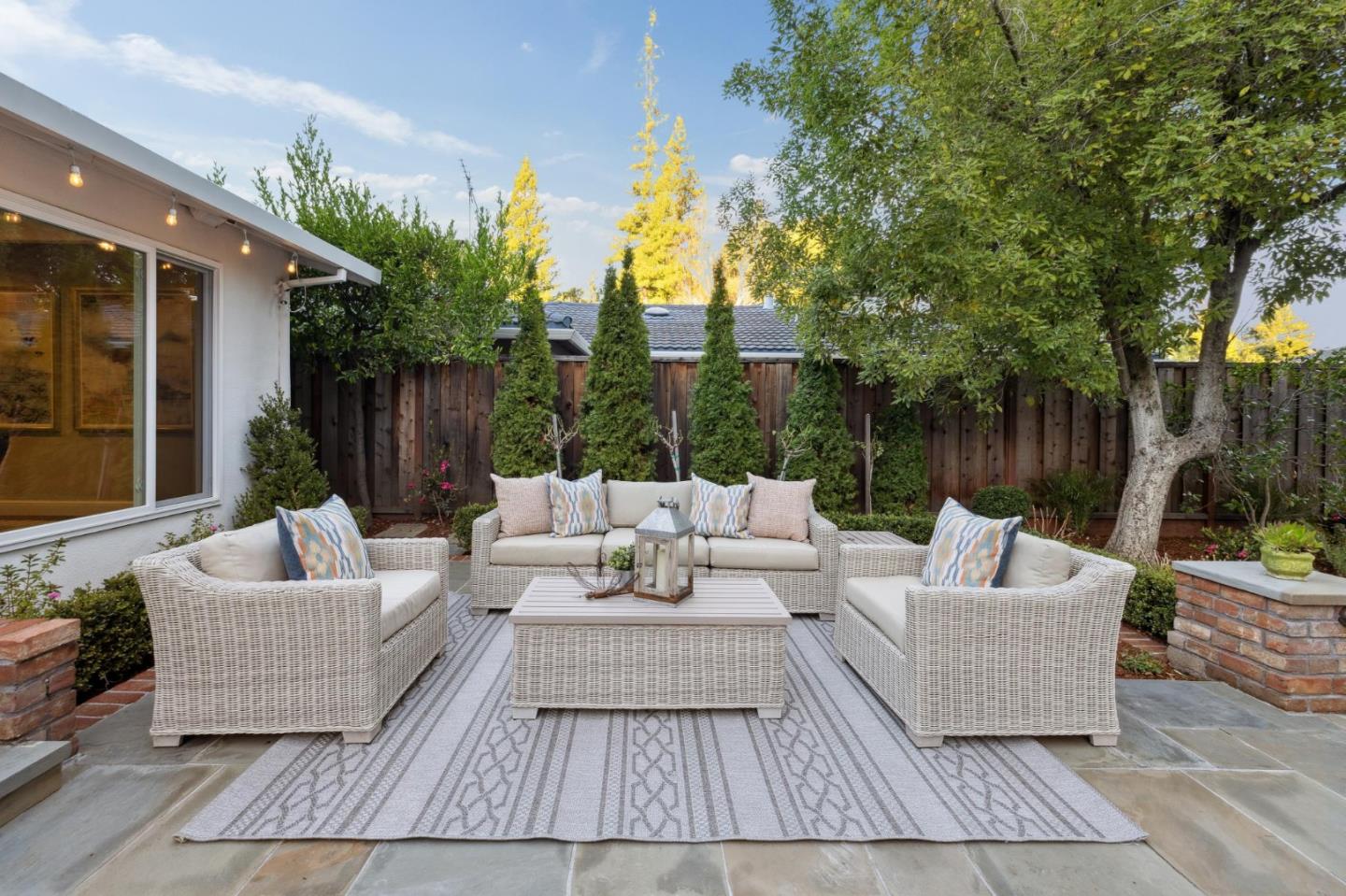On a small cul-de-sac lined with majestic trees, a storybook setting was created on a 9300+/- sq. ft. lot for this charming, updated, 2-bedroom, 2-bathroom home with farmhouse-style appeal. A lush lawn and pleasant garden precede the porch entrance where inside you will find golden hardwood floors, freshly painted walls and trim, sparkling windows and glass doors, lovely lighting and a magical atmosphere. Enjoy culinary arts in the kitchen with marble counters, shaker cabinets, stainless steel appliances and casual dining area. The living and dining rooms share a beamed ceiling, stone fireplace and wall of windows that showcases the enchanting back yard with a slate patio designed for entertaining and dancing under the stars, and a magnificent Heritage oak tree that will take your breath away. After a long day, retreat to your primary bedroom suite with views and access to the back yard, or enjoy quiet mornings in the gazebo while admiring your secret gardens.