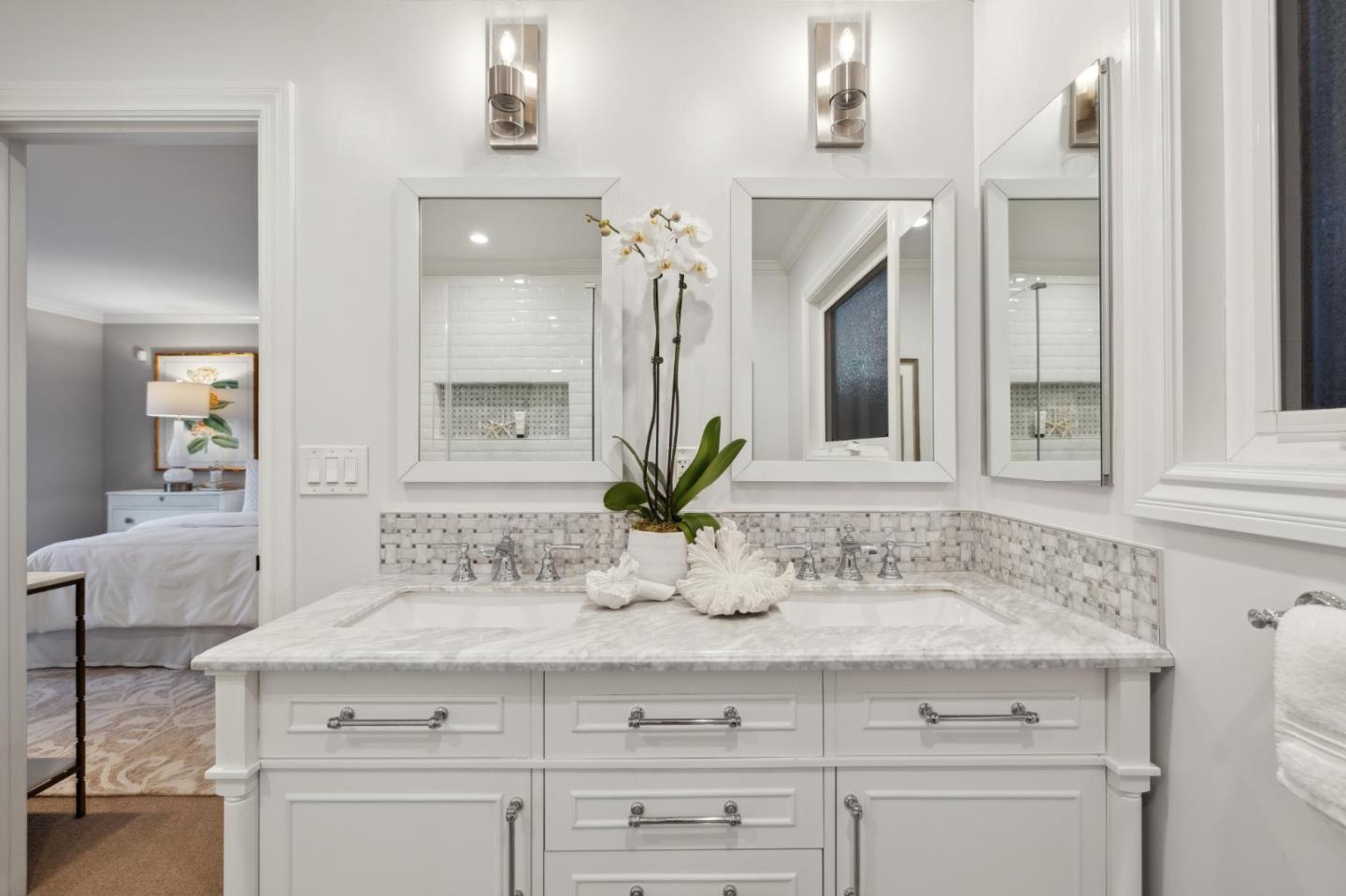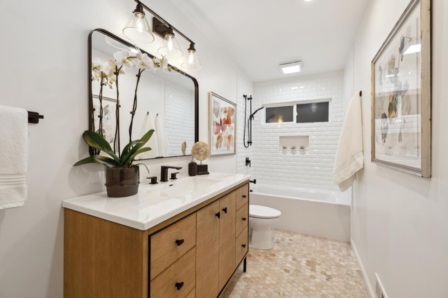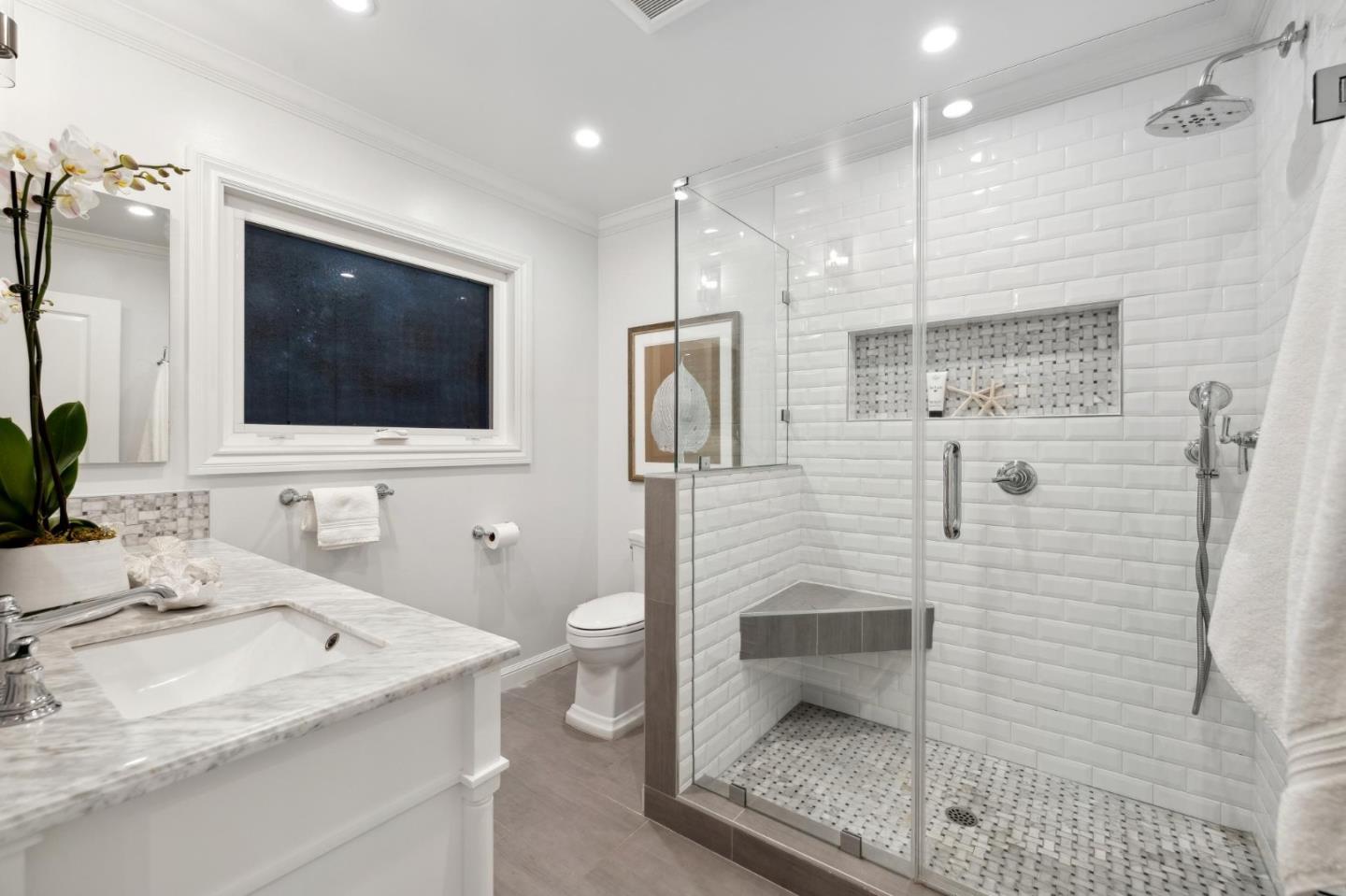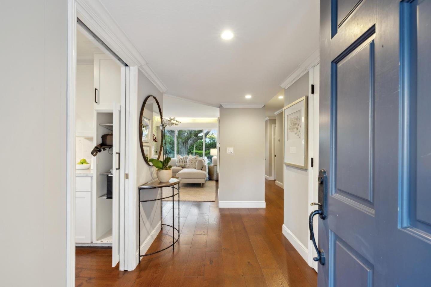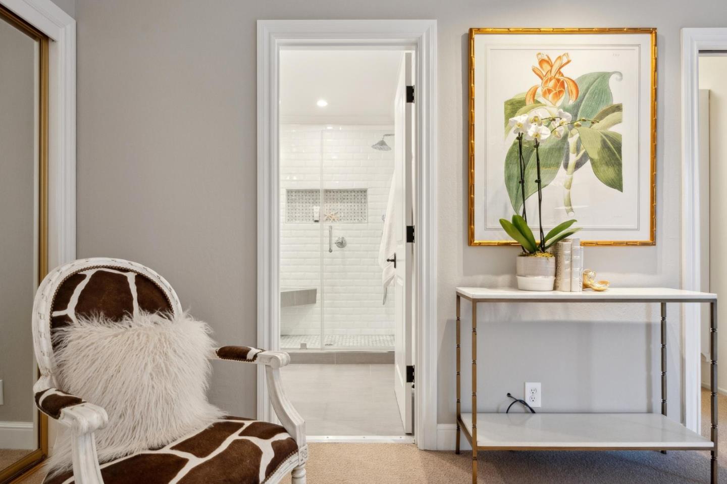 On a small cul-de-sac lined with majestic trees, a storybook setting was created on a 9300+/- sq. ft. lot for this charming, updated, 2-bedroom, 2-bathroom home with farmhouse-style appeal. A lush lawn and pleasant garden precede the porch entrance where inside you will find golden hardwood floors, freshly painted walls and trim, sparkling windows and glass doors, lovely lighting and a magical atmosphere. Enjoy culinary arts in the kitchen with marble counters, shaker cabinets, stainless steel appliances and casual dining area. The living and dining rooms share a beamed ceiling, stone fireplace and wall of windows that showcases the enchanting back yard with a slate patio designed for entertaining and dancing under the stars, and a magnificent Heritage oak tree that will take your breath away. After a long day, retreat to your primary bedroom suite with views and access to the back yard, or enjoy quiet mornings in the gazebo while admiring your secret gardens.