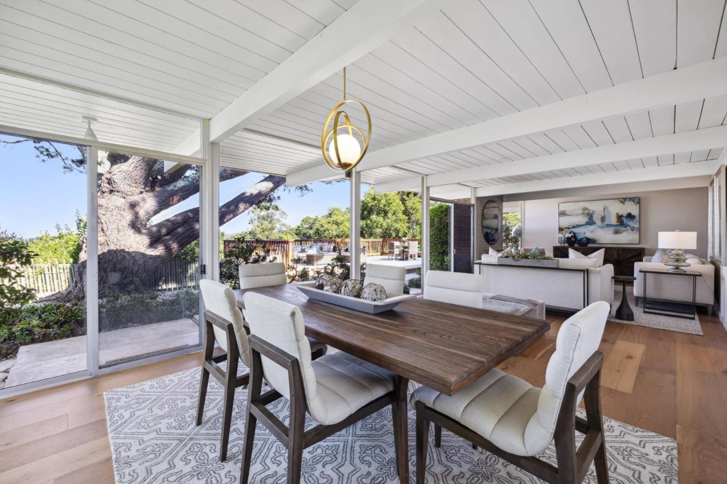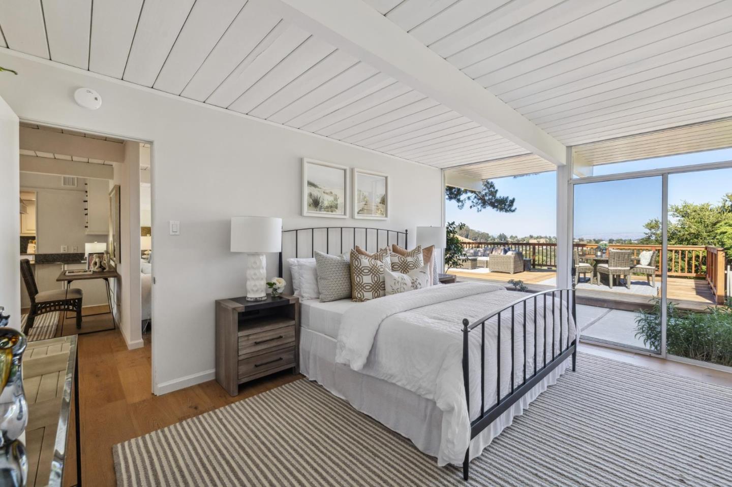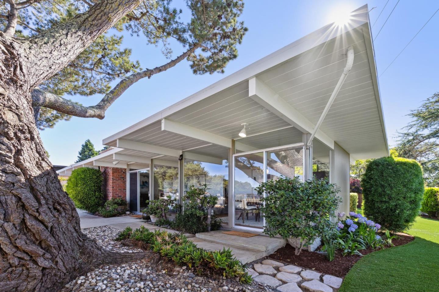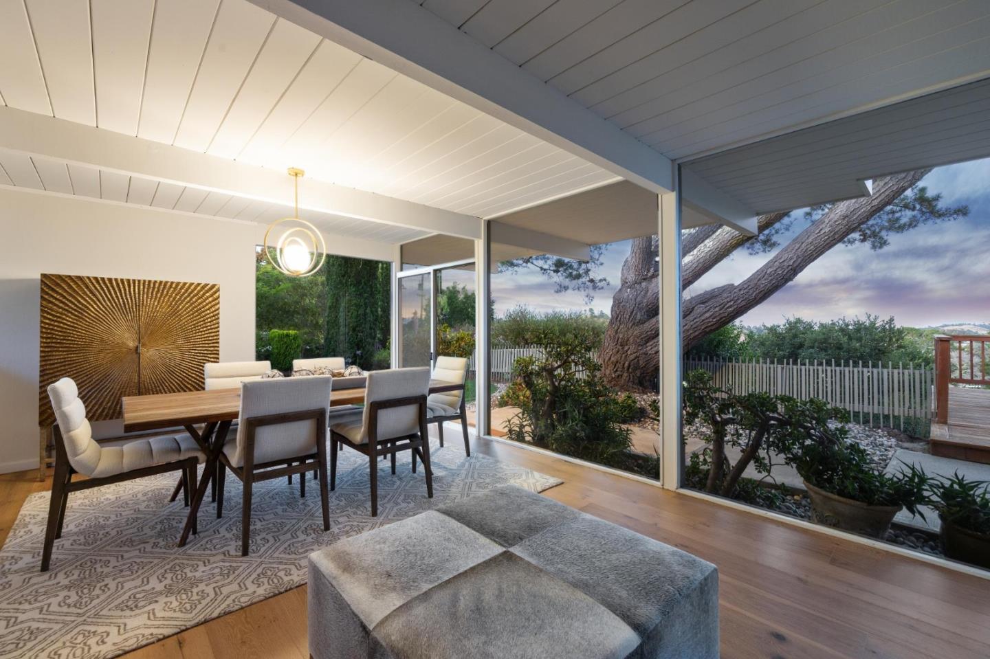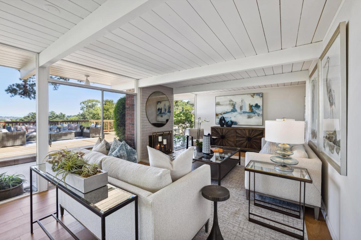 Enjoy epic views from this hilltop Eichler home in the Highlands neighborhood of San Mateo. On a .294+/-acre lot, this classic is true to form with clean lines, abundant light from walls of windows and sliding glass doors, wood plank ceilings with exposed beams, skylights and a fireplace flanked by glass walls. New engineered white oak floors, light fixtures and paint, inside and out, were recently added. Stylish and dramatic, the adventure begins at the front door with a glimpse of vistas ahead. Stunning views from the living room, open dining room and primary suite will stop you in your tracks with awe. Stepping outside to the backyard deck with 180-degree views will take your breath away. Outdoor enjoyment continues from the granite-finished kitchen with a dining area that opens to the intimate front patio and manicured yard, and a second bedroom with side yard access. This home is all about indoor-outdoor living. Enjoy coming home to a private haven with priceless views!