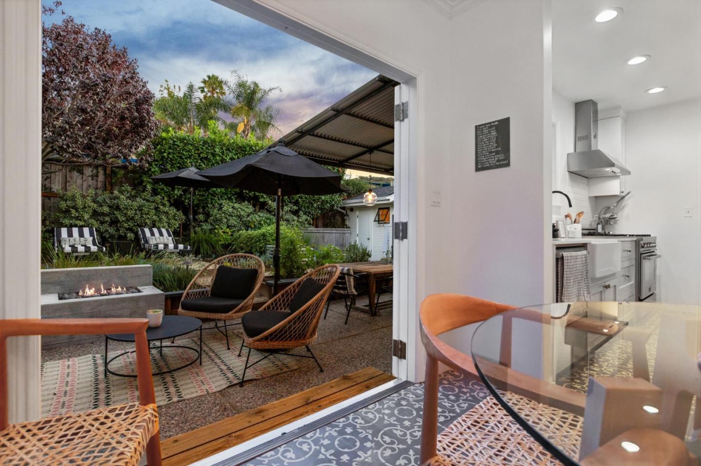 A TASTE OF NAPA VALLEY in the City of Good Living on a creatively reimagined property designed with the relaxed atmosphere of upscale wine country gardens and grounds, with a petite Modern Farmhouse and studio cottage nestled in the midst. Charm begins at the curb with a thoughtfully composed landscape, inviting farmhouse porch, corrugated metal awnings and a paver driveway with gated privacy fence offering a glimpse of the cottage beyond. The all-white Farmhouse interior is brought to life by natural-toned hardwood floors and Moroccan floor tile with bold, geometric flair. Recessed lighting illuminates living spaces, which include a fireside living room with barn door to private bedrooms, a well-conceived kitchen with a classic farmhouse sink and suite of stainless steel appliances, and a dining area with double French doors to a backyard garden oasis, complete with a patio, fireplace, cedar hot tub, raised garden beds, DG lounging platform and a charming studio cottage with an open beam ceiling and full bath, providing versatile options for modern living.