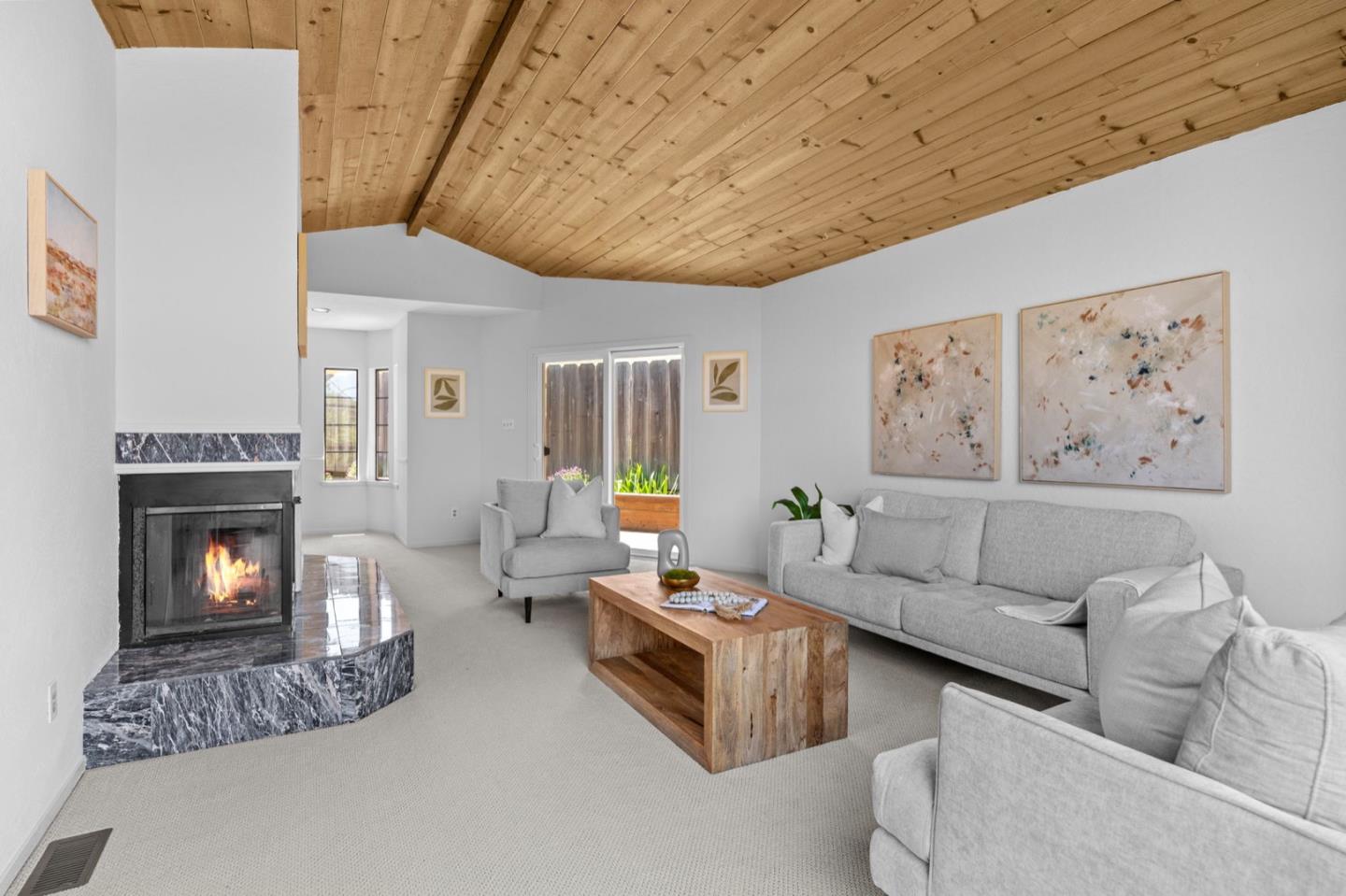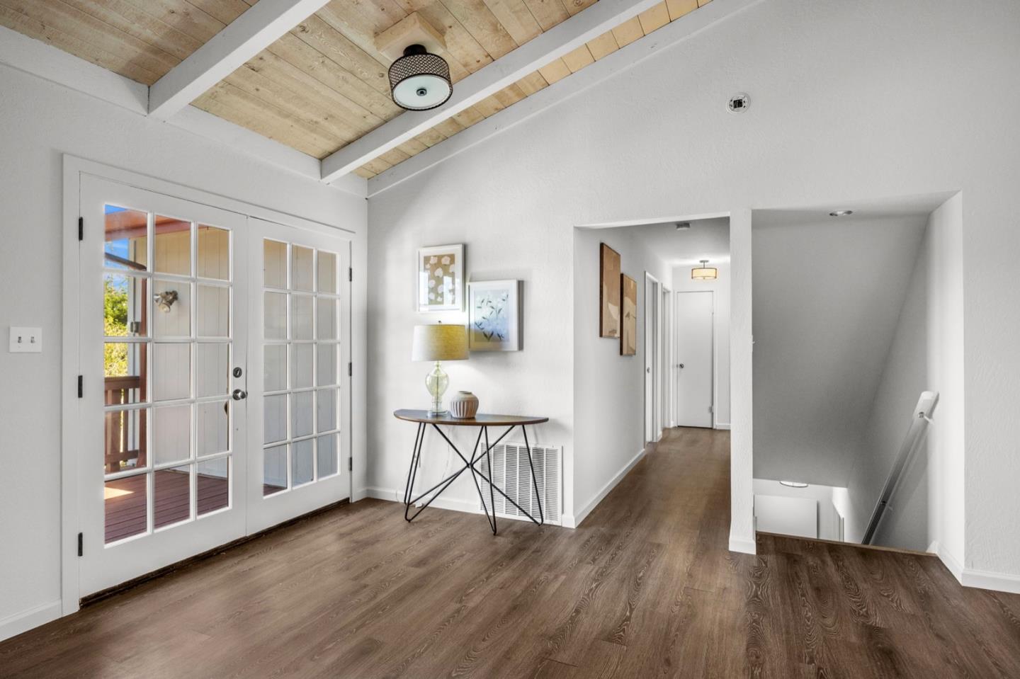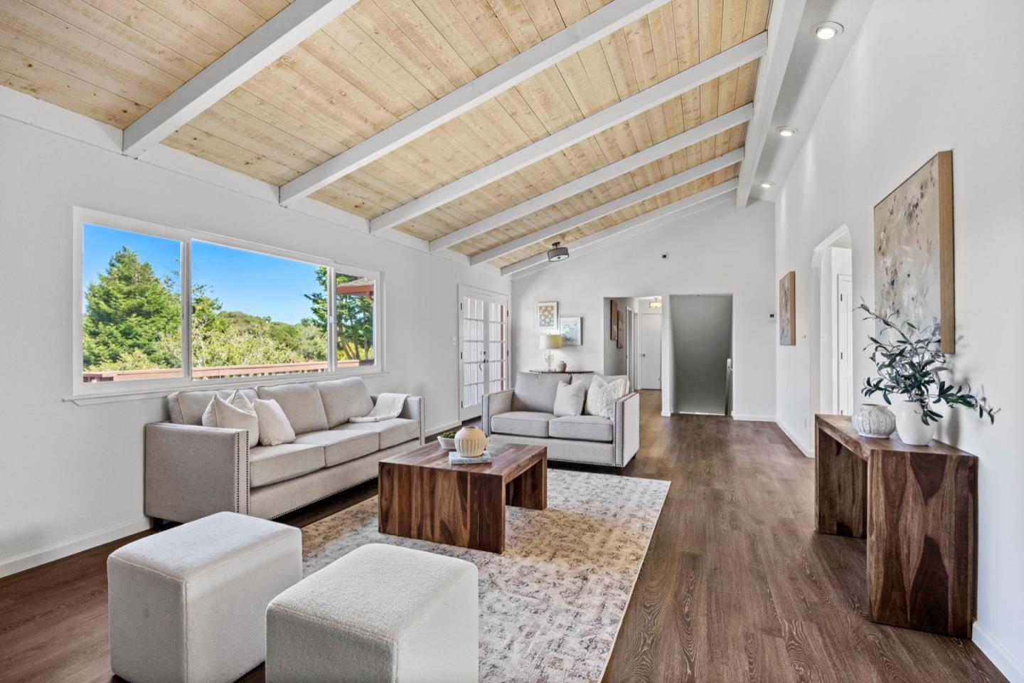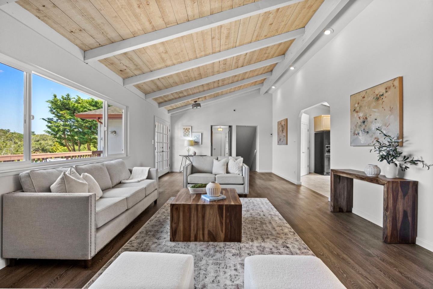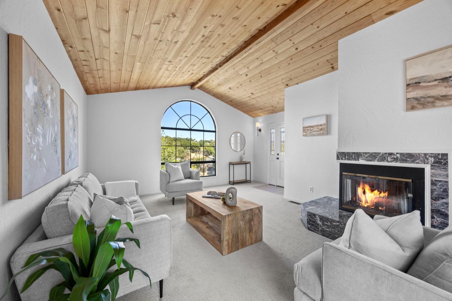 In an oak-studded countryside about six miles from Monterey Bay is a hilltop home that invokes warmth, character and a relaxed California lifestyle. Behind the understated facade is a striking Spanish Modern interior that is open and airy with an earthy elegance. The family-friendly 2,475+/- sf layout spans two levels with formal living and dining rooms, a huge family room, granite kitchen (each has outdoor access), three bedrooms upstairs, including the primary suite, and a spacious secondary suite/office on the lower level with private outdoor access. Striking home features include dramatic vaulted ceilings with beautiful wood planks and exposed beams, abundant natural light from large windows and glass doors (including a floor-to-ceiling Palladian window), newly painted crisp white walls, new Berber carpet and on-trend light fixtures, a sleek marble fireplace, a rugged stone fireplace, and seamless indoor-outdoor transitions to the .25+/-acre lot with decks, lawn and flower beds.